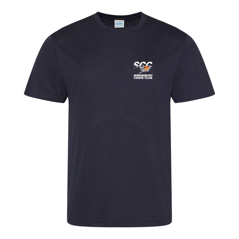 Shrewsbury Canoe Club T-shirt. Navy blue polyester, quick drying T shirt with embroidered club crest to left breast.